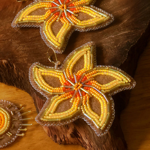Beautiful Carambola earrings. 𖦹 Inspired by the cut shape of delicious Starfruit with a floral twist. They are way more saturated looking in person, with neon notes and a beautiful shine. These earrings are statement earrings. Please be aware of sizing!